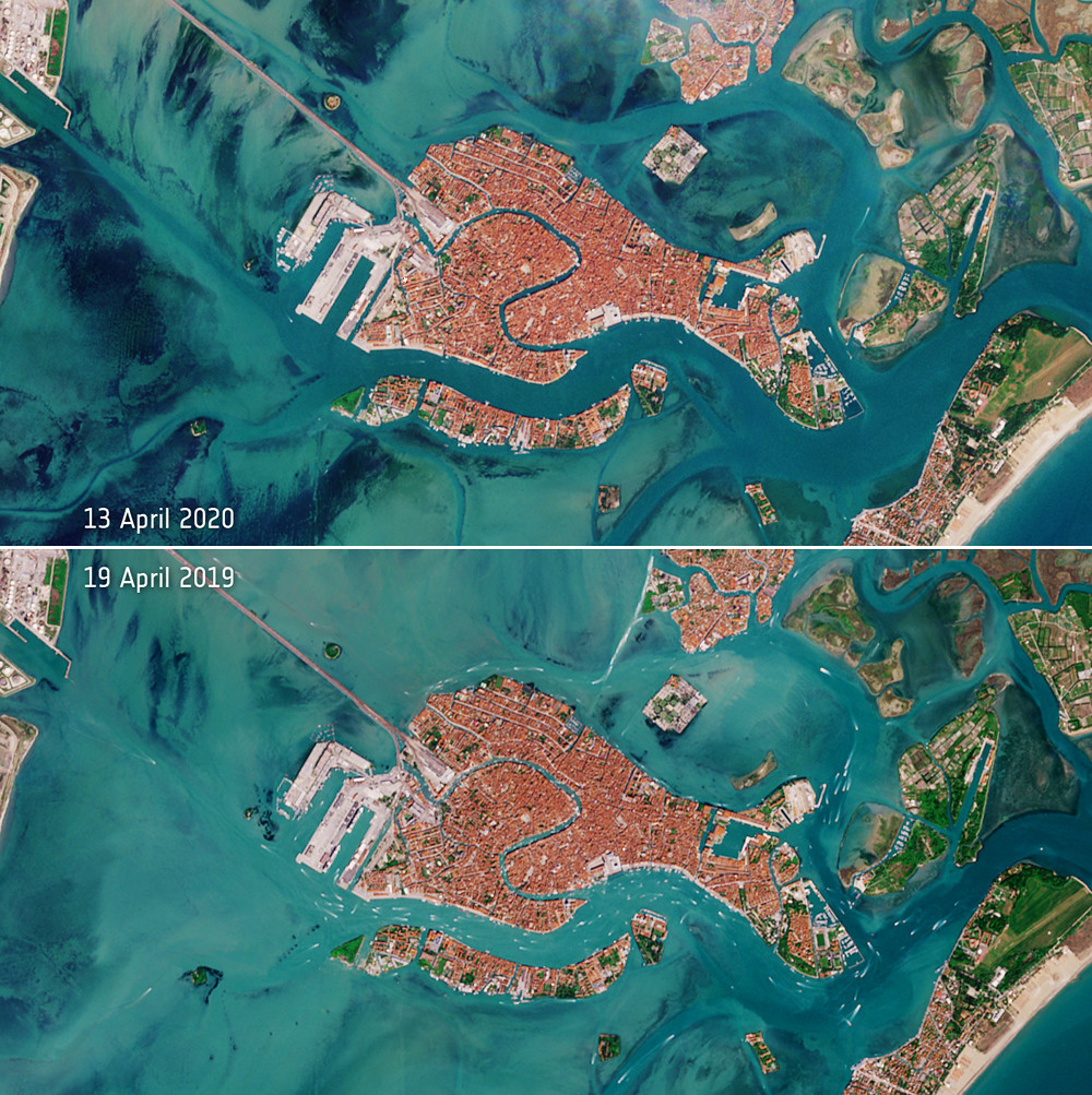 根據《CNN》報導,歐洲太空總署(European Space Agency)近日公布由Sentinel-2衛星拍攝的威尼斯空拍照,只見當地去年4月19日時水質十分混濁,鄰近水域幾乎都是黃澄澄一片泥沙,並有大量船隻在運行;作為對比,今年4月13日該水域已清澈見底。